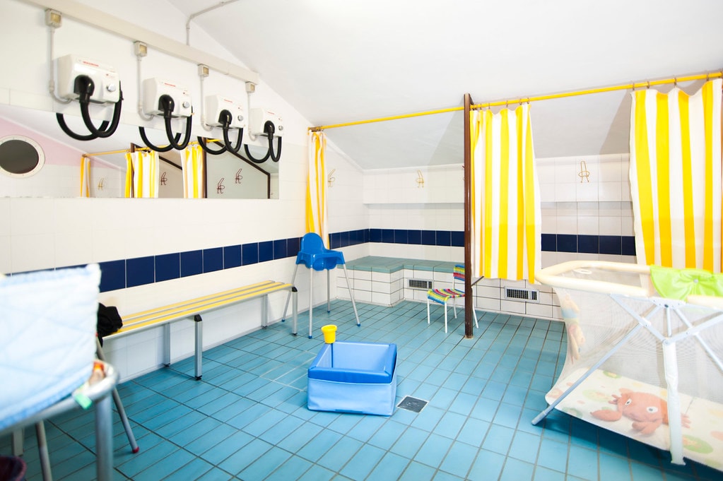 L’impianto ha uno spogliatoio maschile ed uno femminile dotati di box, fasciatoi e seggioloni per i bimbi nonché di phon.